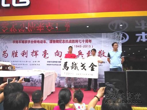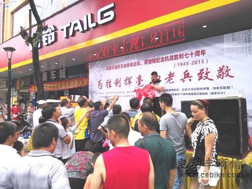 最近,纪念抗战胜利70周年成为了举国上下的一个热门事件,为了70年前那场伟大的胜利,人们通过各种方式纷纷致以敬意。当然,也有很多人将之付诸于行动。8月16日,深圳最大的电动自行车卖场“华南车城”联合台铃电动车、璞物网纪念抗战胜利七十周年,就专门组织了一场“为胜利挥毫,向老兵致敬”的公益捐助活动。该企业承诺,从2015年8月16日到2015年9月15日为期一个月内,每卖出一台电动车,将会通过腾讯公益、新浪微公益平台上面的“抗战老兵关怀”等公益项目捐款50元钱,以此向参与过70年前那场保家卫国的抗战老兵致以崇高的敬意和晚年的关怀。