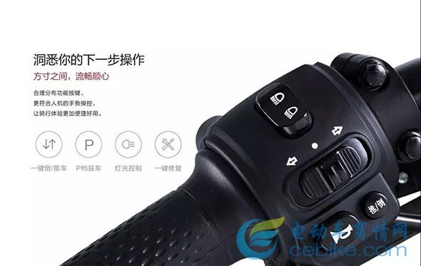 合理的功能按键设计结构,更符合人机的手势操控,一键倒车、P档驻车、灯光控制、一键修复等功能轻松控制,让骑行体验更加便捷好用。