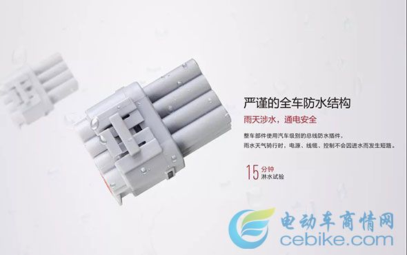 BOX-S整车部件采用汽车级别的总线防水插件,雨水天气骑行时,电源、线缆、控制不会因进水而发生短路。