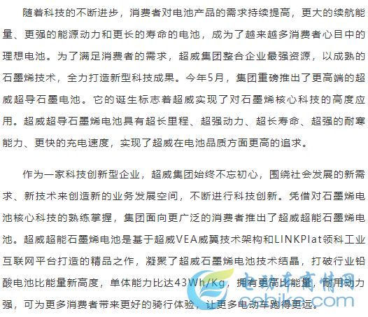 [提要] 超威石墨烯电池行业领先 让十亿电动车跑得更远