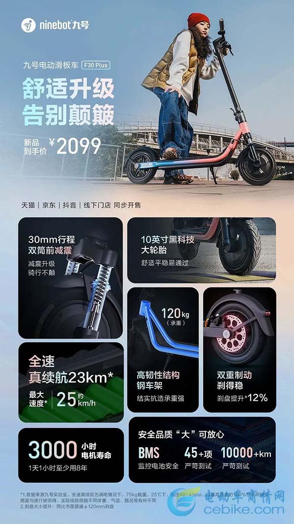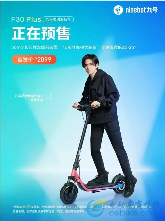此次发布的九号电动滑板车F30 Plus还是易烊千玺九号品牌全球代言人同款。在性能配置方面,30mm长行程双筒前减震、10英寸高弹大轮胎、舒适升级拒绝颠簸,让你的短途出行更加得心应手。新品预售首发价¥2099,超强实力,超值入手!